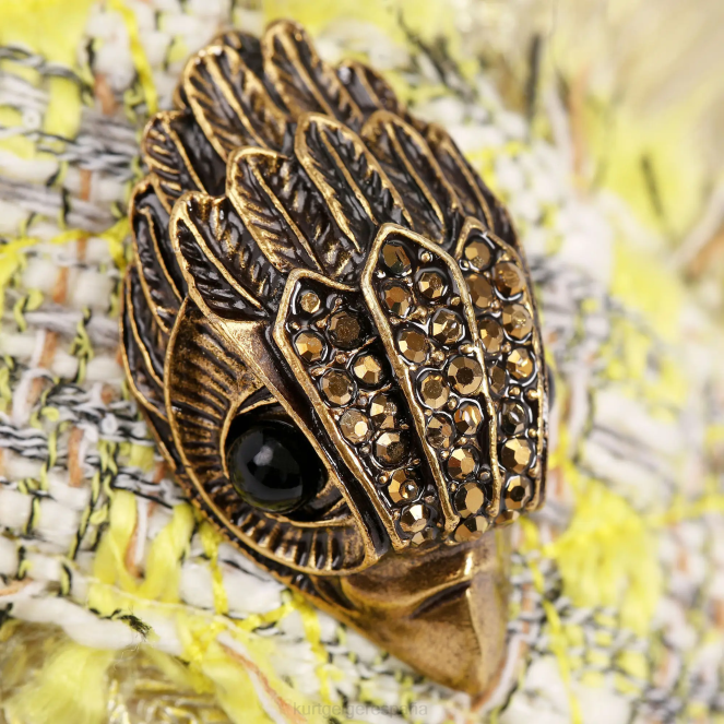 La alpargata Kensington, una incorporación a la colección Kensington, está confeccionada con tiras de tweed amarillo y efecto rafia. la cabeza de águila de latón envejecido presenta cristales y ojos de cuentas negras en la correa.