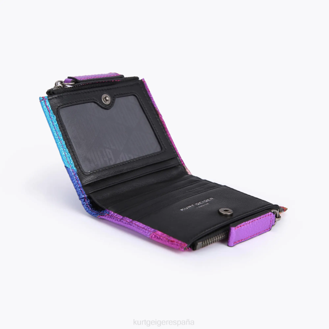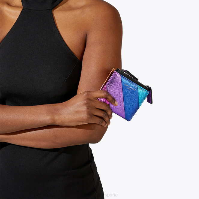 El mini bolso está confeccionado con cuero de vaca de grano granulado laminado metálico con el icónico patrón de rayas diagonales cosidas con el arcoíris. el frente presenta la marca en relieve en lámina plateada.