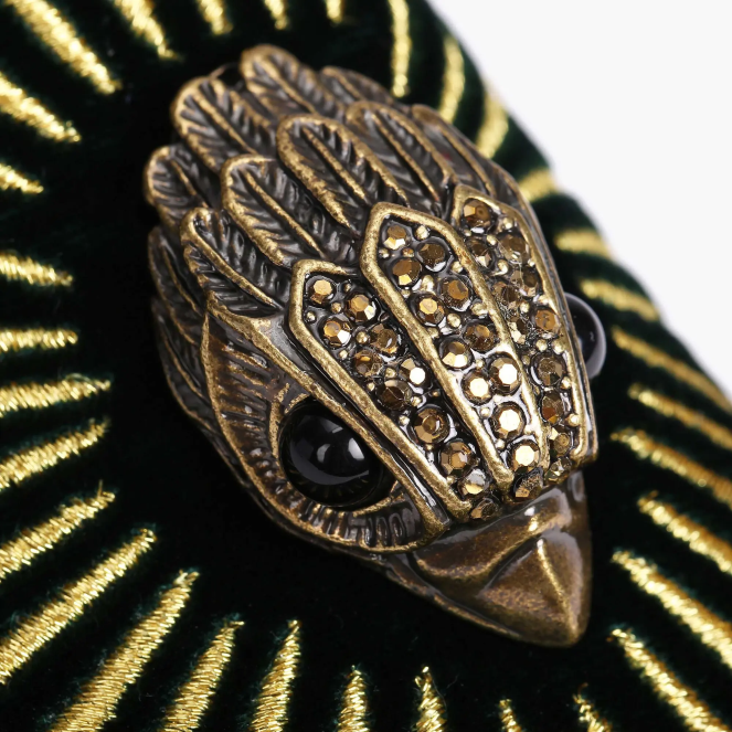 El águila ace verde es un mocasín de terciopelo con cabeza de águila de latón envejecido con cristal de latón opaco y ojos de cuentas negras en el empeine delantero. también hay detalles de hilo dorado.