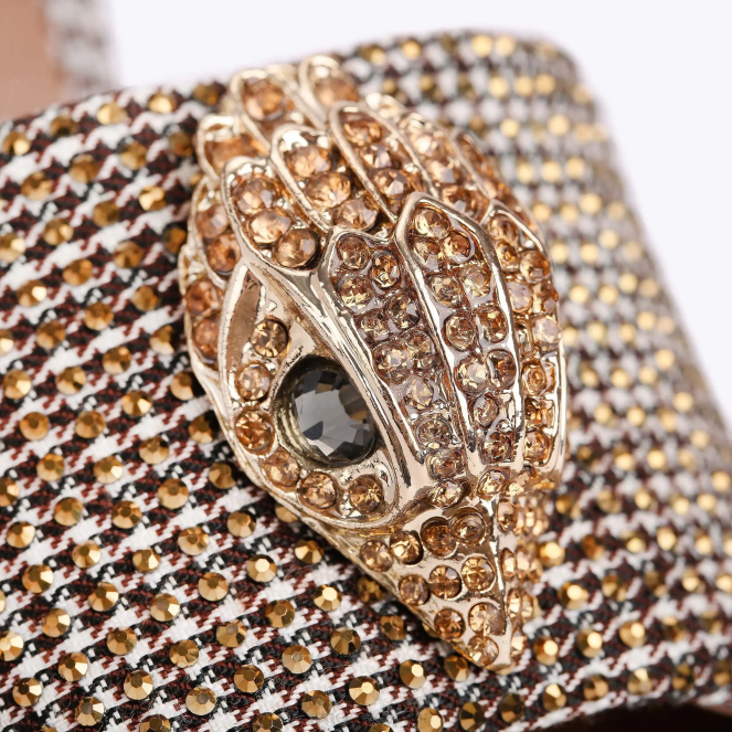 La sandalia Kensington, una incorporación a la icónica colección Kensington, está confeccionada con un tejido de pata de gallo beige con cristales de latón opacos. la cabeza de águila dorada presenta cristales de latón opacos y ojos de cristal negro en la correa.